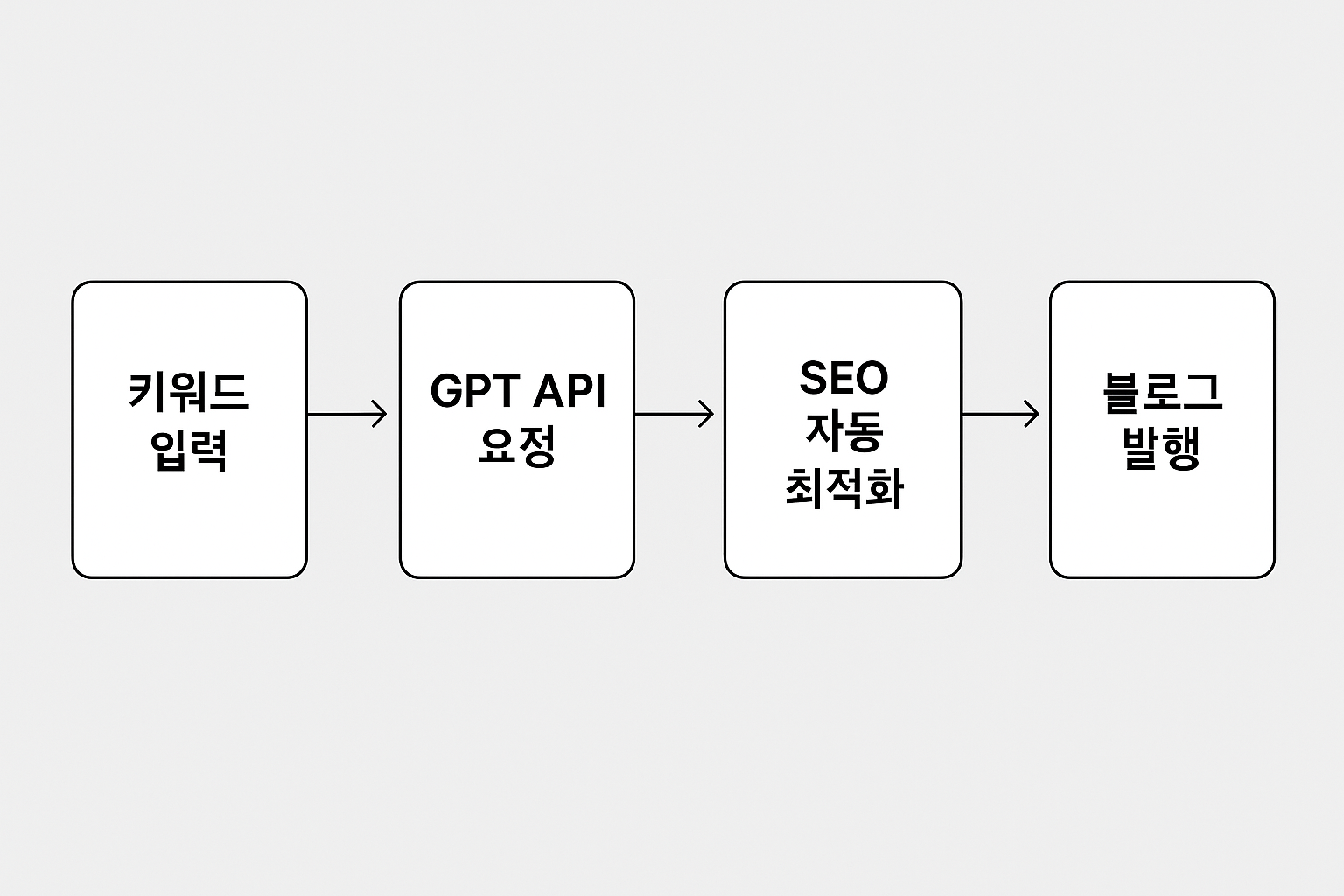흐름도를 통해 보면 키워드 입력에서 시작해 GPT API 요청, 초안 생성, SEO 최적화 단계를 거쳐 발행으로 이어지는 일련의 과정을 시각적으로 확인할 수 있습니다. 이렇게 정리하면 자동화 구조가 한눈에 이해됩니다.