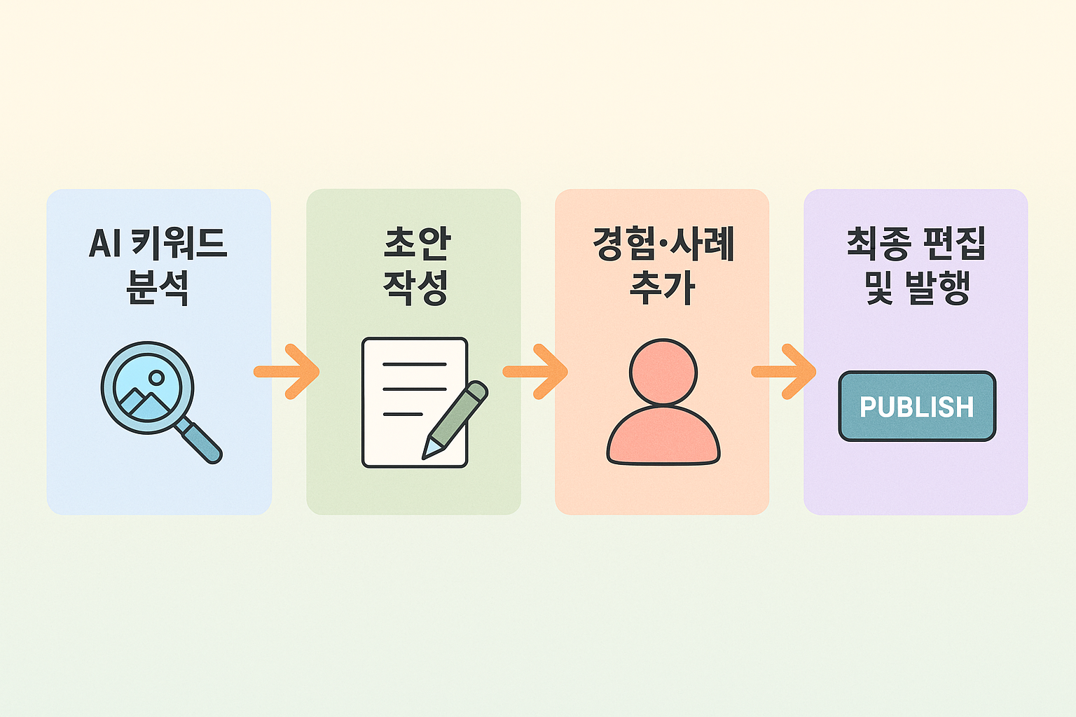 이 흐름도는 글의 출발점을 ‘키워드’가 아니라 ‘검색 의도’로 두고, 구조를 먼저 만든 뒤 GPT를 투입하는 과정을 시각화합니다. 구조가 먼저 정리되면 AI가 만든 초안도 안정적으로 품질을 확보합니다.