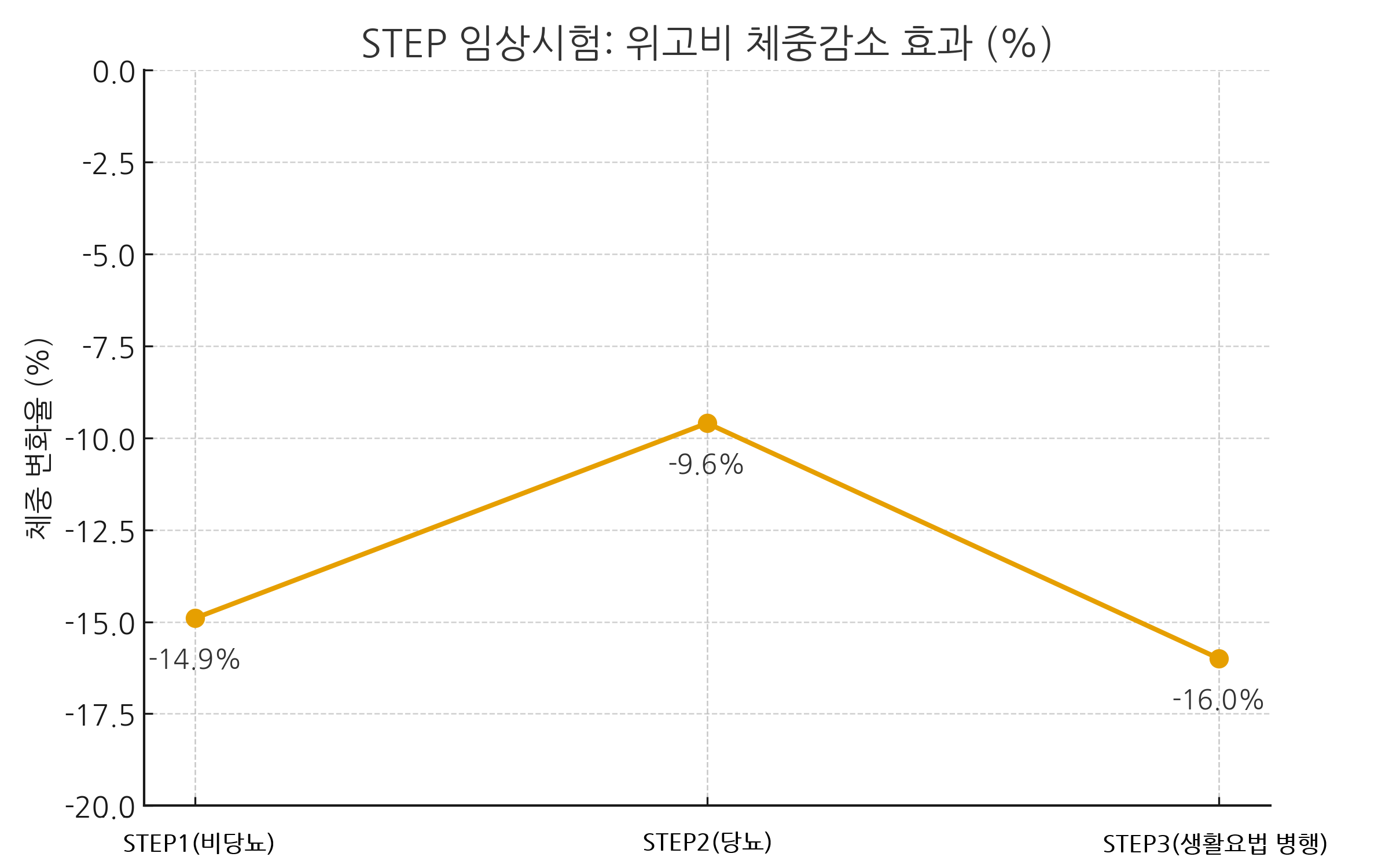 (출처 - The Lancet 2021) - STEP 3 연구(집중적 생활요법 병행)에서는 −16% 이상 감량 효과가 보고되어, 생활습관 교정과 병행할 때 효과가 더 크다는 점이 강조됩니다.