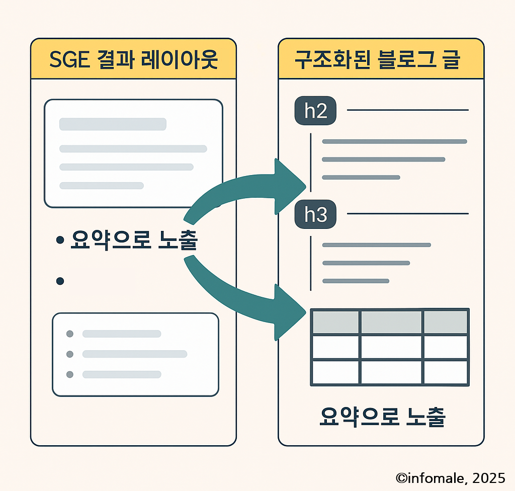 이 인포그래픽은 구조화된 섹션이 SGE의 요약 카드에 어떤 식으로 매핑되는지 보여줍니다. 한 문단에 복잡한 정보를 몰아넣기보다, 의미 단위로 깨끗하게 나눠야 합니다.